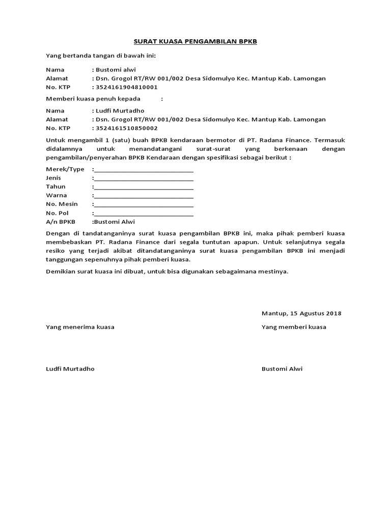 Untuk dan atas nama pemberi kuasa mengambil bpkb dengan data sebagai berikut. Semoga bermanfaat bagi anda yang membutuh contoh sekaligus pengertiannya. Contoh surat kuasa pengambilan bpkb. Bandung 17 agustus 1963 pekerjaan. Contoh surat kuasa pengambilan bpkb ini bisa anda pergunakan untuk mengambil bpkb di showrrom dealer maupun di kantor finance untuk pembelian kendaraan bermotor secara kredit. Pegawai negeri sipil alamat.