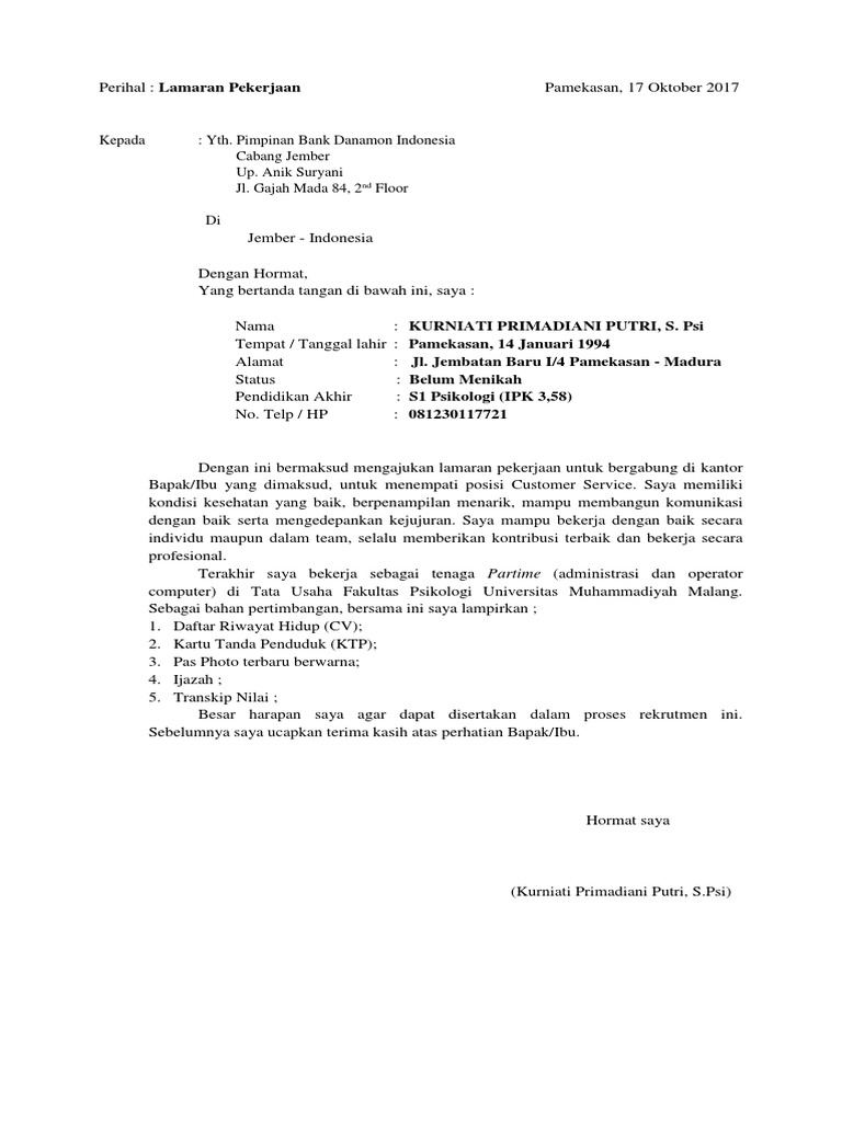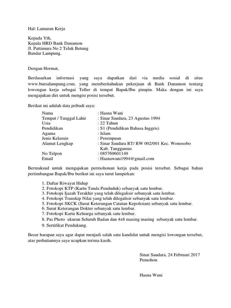 Nah bagi anda yang sekarang sedang mencari pekerjaan untuk bulan januari februari maret april mei juni juli agustus september oktober november dan desember disini adalah tempat yang tepat untuk mengetahui semua tentang. Balikpapan 23 mei 2017. Bagi temen temen yang saat ini sedang mencari referensi tentang bagaimana menyusun sebuah surat lamaran kerja di bank bri yang baik dan benar temen temen bisa melihat contoh seperti di bawah ini. Contoh surat lamaran kerja di bank danamon have a graphic associated with the othercontoh surat lamaran kerja di bank danamon it also will include a picture of a kind that might be seen in the gallery of contoh surat lamaran kerja di bank danamon. Mengenai contoh surat lamaran kerja di bank sebenarnya sudah banyak yang membagikannya di internet anda tinggal mencari dan menseleksi yang mana menurut anda paling sesuai dengan kebutuhan anda. Contoh surat lamaran kerja di bank danamon ini dapat anda gunakan untuk melamar pekerjaan di bank danamon yang hampir di seluruh cabang bank danamon membutuhkan karyawan untuk ditempatkan di cabang cabang bank danamon lainnya sehingga tak heran jika banyak orang yang ingin melamar kerja di bagian bank.