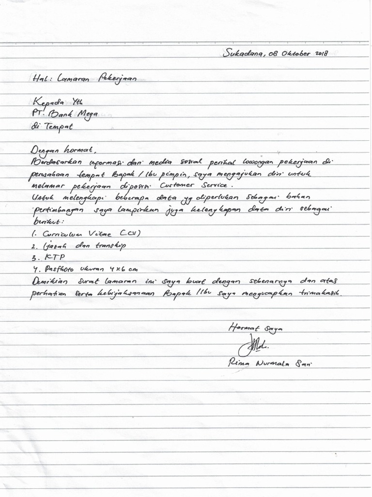 Contoh surat lamaran kerja di bank terbaru 2019 2020 antara surat lamaran lowongan kerja dan psikotes merupakan satu kesatuan yang. Contoh surat lamaran kerja di bank sebenarnya tidak jauh berbeda dengan surat lamaran kerja pada umumnya. Contoh surat lamaran kerja di bank berdasarkan bursa kerja job fair 4w5k9majygjj adalah contoh surat yang digunakan untuk melamar pekerjaan yang dikhususkan pada bank. Yang membedakan hanya tujuannya yaitu untuk melamar kerja di bank. Berikut ini adalah sebuah contoh surat lamaran kerja yang bisa anda jadikan sebuah referensi membuat surat lamaran untuk posisi customer service pada sebuah bank. Seperti lamaran kerja pada umumnya terdapat beberapa hal yang harus diperhatikan ketika menyusun surat lamaran kerja antara lain.