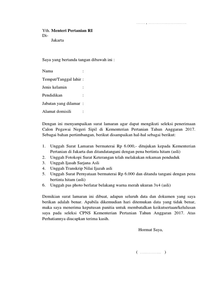 Contoh surat lamaran cpns kementerian pertanian tahun 2017 contoh surat lamaran tepat di tanggal 1 agustus 2017 penerimaan cpns telah dimulai. Download contoh surat lamaran cpns 2018 kementan. Surat lamaran cpns 2018 kementan pdf. Jadi anda tidak perlu repot repot harus mengetik ulang format surat lamaran tersebut cukup mengganti nama. Contoh surat lamaran cpns 2019 di 8 kementerian di kementerian pertanian kementan kementerian luar negeri kemenlu hingga kementerian perhubungan. Pendaftaran cpns juga tidak terlalu susah karena bisa dilakukan secara online.