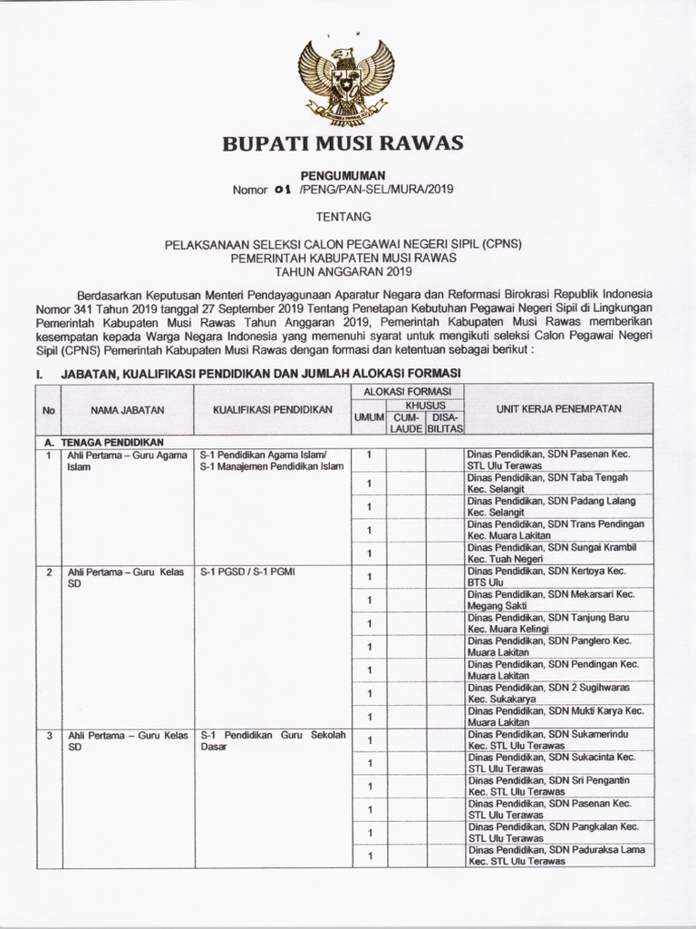 Informasi surat lamaran cpns 2018 kabupaten musi rawas utara sehubungan dengan penerimaan calon pegawai negeri sipil cpns kabupaten musi rawas utara tahun anggaran 2018. Musi rawas formasi tahun 2019. 9507 orang umum. Formasi dan jabatan cpns 2019 kabupaten musi rawas dokumen yang harus disiapkan pada formasi dan jabatan cpns 2019 kabupaten musi rawas bagi anda yang memenuhi syarat untuk menyiapkan dokumen cpns 2019. Panitia seleksi penerimaan cpns kabupaten musi rawas utara tahun 2018 di muara rupit dengan hormat sehubungan dengan penerimaan calon pegawai negeri sipil cpns kabupaten musi rawas utara tahun anggaran. Download pengumuman jadwal tes ujian cpns 2019 kab.