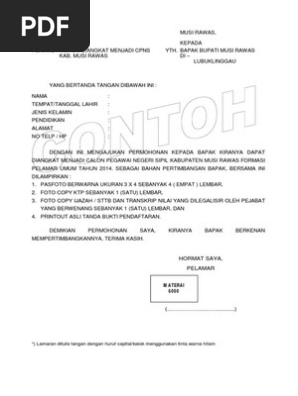 Contoh surat lamaran cpns musi rawas. Sehubungan dengan penerimaan calon pegawai negeri sipil cpns kabupaten musi rawas utara tahun anggaran 2018. Penerimaan calon pegawai negeri sipil cpns pemerintah kabupaten musi rawas utara tahun 2018. 23 sep 2018. Berita palembang kemenpppa buka 25 formasi cpns 2019 berikut contoh surat lamaran dan pernyataan kementerian pemberdayaan perempuan dan perlindungan anak membuka pendaftaran seleksi calon pegawai negeri sipil cpns 2019 untuk 25 formasi. Formasi dan jabatan cpns 2018 pemerintah kab. Jadwal pelaksanaan seleksi penerimaan cpns kab.