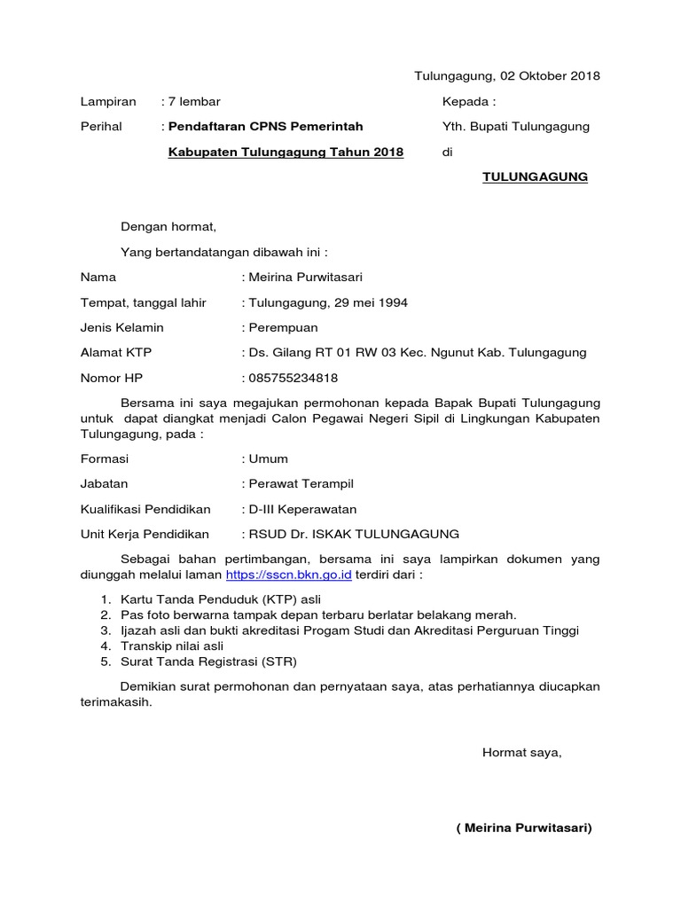 Contoh surat lamaran pekerjaan sebagai perawat rumah sakit. Sebagai contoh berikut ini adalah contoh surat surat resmi berupa lamaran kerja untuk menjadi perawat di sebuah rumah sakit. Dalam mendaftar cpns maka surat lamaran cpns tidak selamanya dibutuhkan. Sebenarnya calon peserta seleksi cpns juga bisa mengunduh melalui images for contoh surat lamaran cpns 2018. Ini contoh surat lamaran kerja perawat yang baik dan benar. Contoh surat lamaran cpns 2019.