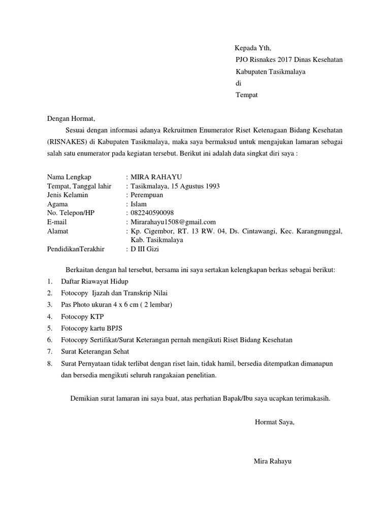 Contoh surat lamaran kerja yang baik dan benar sesuai dengan eyd ejaan yang disempurnakan untuk melamar pekerjaan di berbagai instansi baik bumn maupun swasta lengkap dengan filedoc siap untuk didownload dan diprint outcetak. Contoh surat lamaran kerja enumerator kesehatan adalah contoh lamaran pekerjaan terbaru yang akan admin bagikan pada kesempatan ini untuk anda yang ingin melamar pekerjaan sebagai enumerator. Fotocopy ijazah terakhir dan transkrip nilai dilegalisir 1 lembar 4.