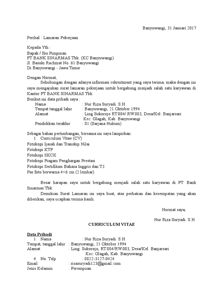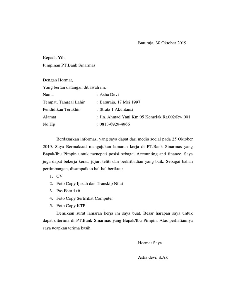 Contoh surat lamaran kerja bank sinarmas. Seperti lamaran kerja pada umumnya terdapat beberapa hal yang harus diperhatikan ketika menyusun surat lamaran kerja antara lain. Contoh surat lamaran kerja sinarmas indonesia sekolah menengah pertama 5 pts. Bagi temen temen yang saat ini sedang mencari referensi tentang bagaimana menyusun sebuah surat lamaran kerja di bank bri yang baik dan benar temen temen bisa melihat contoh seperti di bawah ini. Baik mereka yang baru lulus kuliah s1 atapun mereka yang lulus sma atau smk tidak hanya mereka yang fresh graduate yang membutuhkan surat lamaran kerja mereka yang ingin pindah kerja juga membutuhkan surat lamaran kerja untuk tempat pekerjaan. Contoh surat lamaran kerja di bank sinarmas misalkan anda seseorang yang tengah mencari lowongan pekerjaan di bank kemudian anda menemukan lowongan kerja di bank sinarmas melihat segala persyaratan yang diminta ternyata kualifikasinya cocok untuk anda dan anda pun tertarik untuk mengajukan lamaran pekerjaantapi selanjutnya anda kebingungan bagaimana menulis surat lamaran kerja yang baik. Yang membedakan hanya tujuannya yaitu untuk melamar kerja di bank.