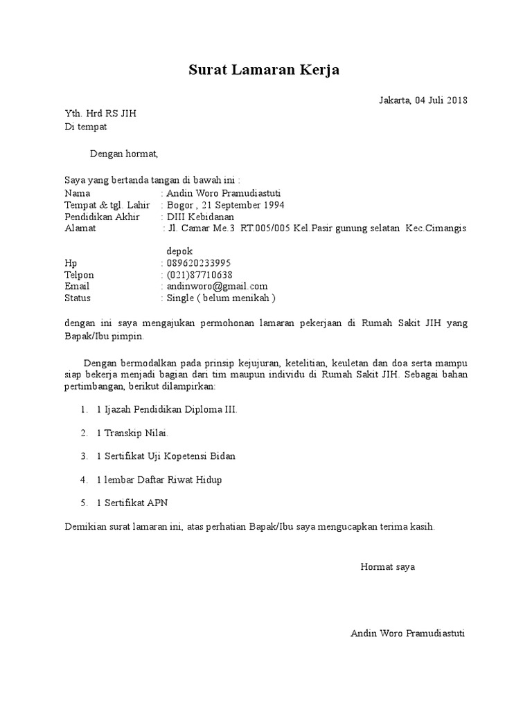 Contoh surat lamaran kerja bidan tahukah anda bahwa pekerjaan menjadi seorang bidan kian dibutuhkan beberapa tahun terakhir ini hal ini dibuktikan dengan semakin banyaknya pembangunan puskesmas dan rumah sakit maupun klinik di indonesia memang jika ditilik secara mendalam pekerjaan bidan memang penting sebab bidan berguna dalam melakukan bimbingan dan penyuluhan kepada individu keluarga. Baik itu bidan klinik puskesmas rumah bersalin ataupun rumah sakit.
