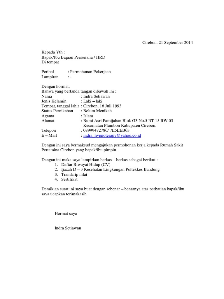 Hal ini bisa kita buktikan dengan semakin banyaknya orang yang memilih jurusan kesehatan saat menempuh pendidikan tinggi. Berikut contoh surat lamaran kerja yang dapat dijadikan referensi untuk melamar pekerjaan di berbagai instansi. 3surat lamaran kerja hendaknya ditulis secara manual dan memang anda yang membuatnya 4lengkapi dengan data data yang dibutuhkan oleh perusahaan tempat anda melamar kerja 5lampirkan surat pendukung lainnya seperti sertifikat pengalaman kerja contoh surat lamaran kerja bali 20 maret 2018 kepada yth. 15 contoh surat lamaran kerja di rumah sakit berbagai posisi bekerja di suatu rumah sakit tentu merupakan impian yang sangat besar bagi seseorang.