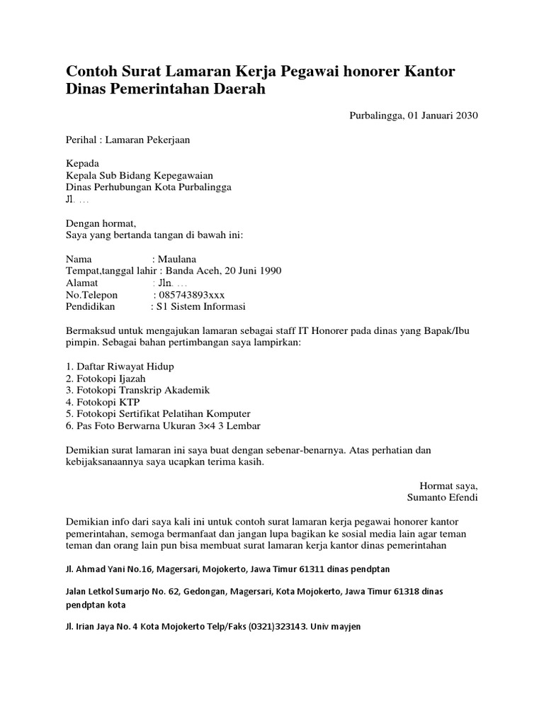 Semoga web blog ini lebih berkembang lagi. Contoh surat lamaran kerja ke dinas walaupun masih berstatus honorer setidaknya anda sudah memegang suatu pekerjaan yang pasti jauh lebih dari pada. Dengan hormat sehubungan dengan adanya penerimaan tenaga kerja honorer yang dimuat pada harian suara rakyat pada sabtu 21 mei 2016 maka saya yang bertanda tangan di bawah ini. Kepala biro kepegawaian dinas perhubungan kota bandung di tempat. Contoh surat lamaran cpns dinas perhubungan halo sahabat. Terima kasih atas sharingnya tentang contoh surat lamaran pekerjaan.