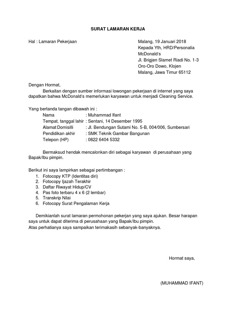 Contoh surat lamaran kerja mcdonald s contoh surat lamaran kerja mcdonalds contoh surat lamaran kerja mcdonald s locations contoh surat lamaran kerja mcdonald s nutrition contoh surat lamaran kerja bahasa inggris contoh surat lamaran kerja dan cv contoh surat lamaran kerja bahasa indonesia contoh surat lamaran kerja umum contoh surat. By pass ngurah rai no109 sanur denpasar sel kota denpasar bali dengan hormat berdasarkan informasi lowongan kerja di dari internet per tanggal 25 july 2017 bahwa mcdonalds sanur sedang membutuhkan tenaga kerja untuk pekerjaan. Contoh surat lamaran kerja ini dibuat tentu saja untuk menjadi referensi bagi anda yang sedang mencari panduan untuk membuat surat lamaran kerja. Contoh surat lamaran kerja di alfamart. Anda dapat melihat dengan jelas contoh surat lamaran kerja mcdonald menggunakan desktop anda tablet android atau iphone dan perangkat smartphone lainnya secara gratis. Download contoh surat lamaran kerja sebagai crew restaurant di mc donald sebagai bahan penunjang untuk menulis lamaran yang baik dan menarik.