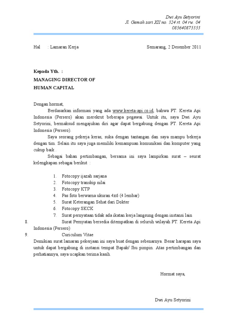 Contoh surat lamaran kerja di pt kai. Contoh surat lamaran kerja di pt kai sudah menjadi hal yang lumrah ketika melamar kerja di suatu badan usaha atau instansi kita sebgai pelamar kerja membuat surat lamaran kerja. Contoh surat lamaran kerja berikut contoh surat lamaran pekerjaan yang bisa kamu download file dokumennya. Contoh surat lamaran kerja di alfamart. Jalan perintis no053 demak. Saat ini sarana maupun prasarana transportasi terus meningkat di indonesia terutama di jalur darat. Contoh surat lamaran kerja di pt kai dengan semakin meningkatnya sarana dan prasarana tranportasi di indonesia terutama untuk jalur darat membuat pemerintah indonesia berinisiatif untuk menciptkan cabang transportasi baru di bidang kereta api baik dengan menciptakan monorail ataupun dengan membuka gerbong gerbong kereta baru yang dikepalai oleh pt kereta api indonesia persero.