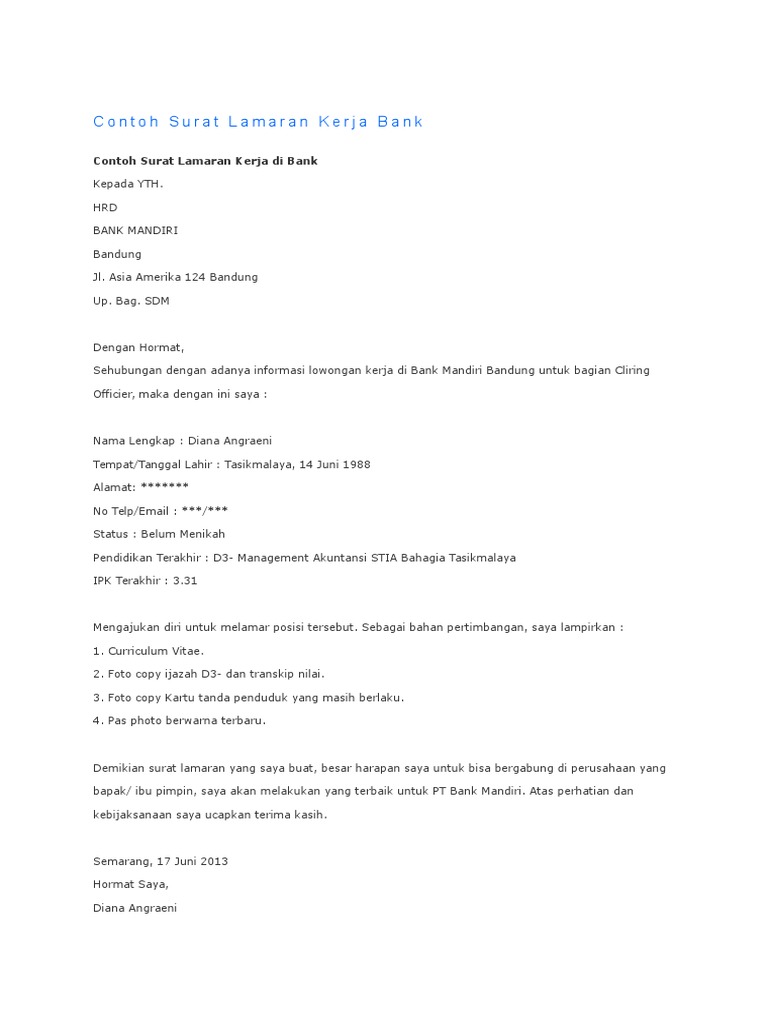 Jadi contoh surat lamaran kerjanya silakan anda modifikasi sesuai keperluan. Pada umumnya pekerjaan adalah kebutuhan manusia untuk menghasilkan uang demi mencukupi kebutuhan hidup sehari hari. Contoh surat lamaran kerja yang baik dan benar sesuai dengan eyd ejaan yang disempurnakan untuk melamar pekerjaan di berbagai instansi baik bumn maupun swasta lengkap dengan filedoc siap untuk didownload dan diprint outcetak. Bank bank tersebut biasa membuka lowongan untuk posisi marketing teller dan lainnya. Mulai dari bni mandiri bpr bca mandiri syariah ataupun ke bri. Postingan ini jawaban jika anda mencari surat lamaran kerja skl yang pas dan mudah didownloadedit dengan microsoft word.