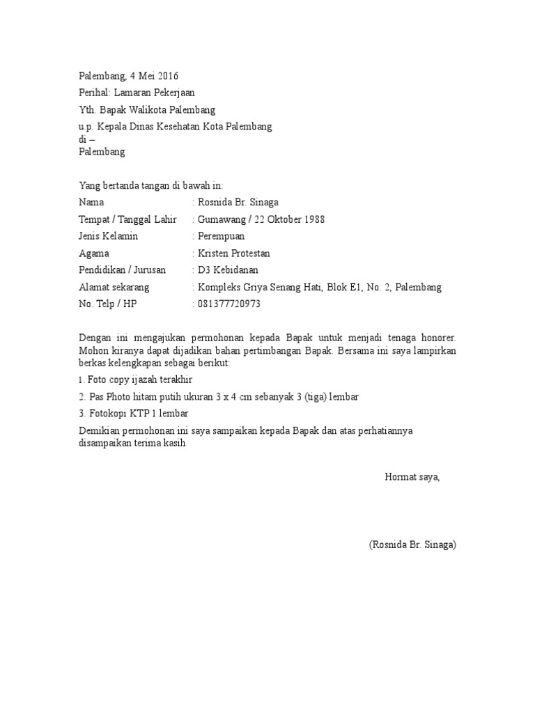 Contoh surat lamaran kerja honorer puskesmas. Surat lamaran pekerjaan jenis ini memiliki perbedaan pada bagian tujuan posisi yang dilamar. Contoh surat lamaran kerja honorer puskesmas ben jobs they are so many great picture list that may become your creativity and informational purpose of contoh surat permohonan magang bidan di puskesmas design ideas for your own collections. Berikut ini adalah salah satu contoh surat pernyataan salah satu persyaratan perihal lamaran kerja pada sebuah puskesmas. Pengertian surat lamaran kerja bidan. Contoh surat lamaran bidan tidak berbeda dengan surat lamaran lainnya. Akan tetapi karena tujuan tempat bekerja anda.