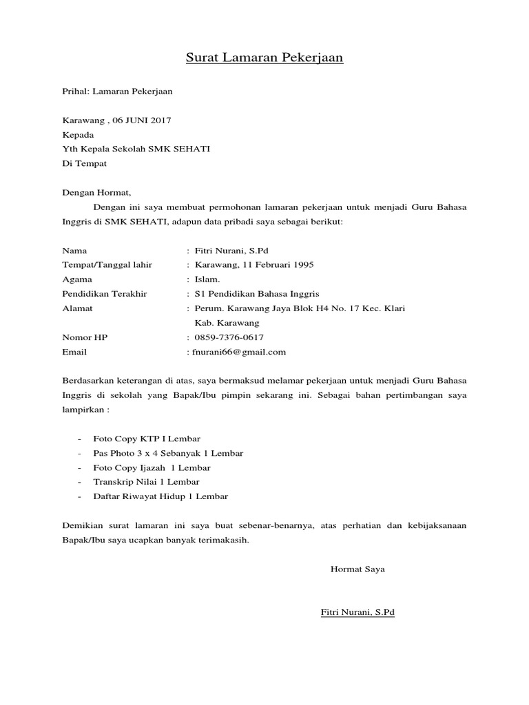 Namun kesulitan mencari pekerjaan sekarang ini seringkali menjadi momok yang menakutkan bagi banyak orang. Walaupun memiliki pendidikan yang lumayan namun belum bisa menjamin kalau seseorang itu akan mendapatkan pekerjaan dengan mudah. Berikut kumpulan contoh surat lamaran kerja guru tk paud sd smp sma smk yang bisa ditulis dengan tulisan tangan atau bisa juga di print tergantung kebutuhan pelamar. Sedangkan pada kesempa kali ini mimin ingin berbagi tentang contoh surat lamaran kerja guru yang baik dan benar. Namun jika yang anda cari adalah informasi. Dengan hormat berkenaan dengan informasi lowongan pekerjaan yang terdapat di harian medan jaya tentang lowongan pekerjaan untuk guru smp negeri 1 medan maka untuk itu saya ingin mengajukan permohonan lamaran pekerjaan untuk menempati posisi tersebut di atas.