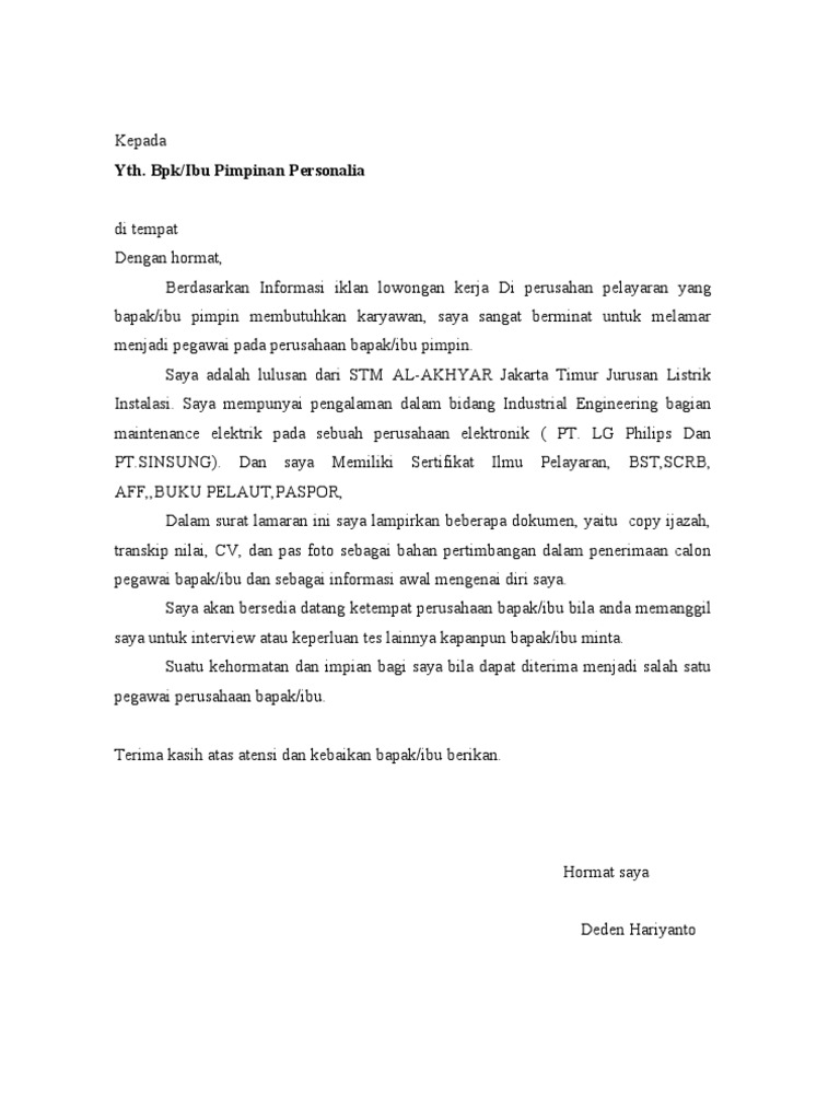 Nah untuk menutupi kebutuhan tersebut maka seseorang harus memiliki pekerjaan dan bisa mendapatkan penghasilan. Contoh surat lamaran pelaut bahasa inggris tujuanya supaya perusahaan tau dan mungkin akan mempertimbangkan lamaran saudara. Contoh surat lamaran kerja di alfamart. Susah cari contoh cv lamaran kerja buat pelaut maupu cv lamaran kerja kantoran yang keren dan bagusnah disini saya sediakan contoh cv lamaran kerja pelaut buat pelaut maupun buat lamaran lainyatinggal di ganti fotonya dan alamat serta judul lamaranyaanda mendapatkan contoh lamaran kerja yang kerensilahkan anda downlond disini dan dan dalam beberapa detik file lamaran kerja ini akan masuk. Surat lamaran kerja pelaut untuk soal melamar kerja memang dibutuhkan banyak sekali hal tentang pengalaman tetapi tidak semua membutuhkan pengalaman kerja. Nah jika anda juga berencana melamar pekerjaan di perusahaan maka contoh surat lamaran kerja di persuahaan yang akan saya bagikan di bawah ini patut anda simak.