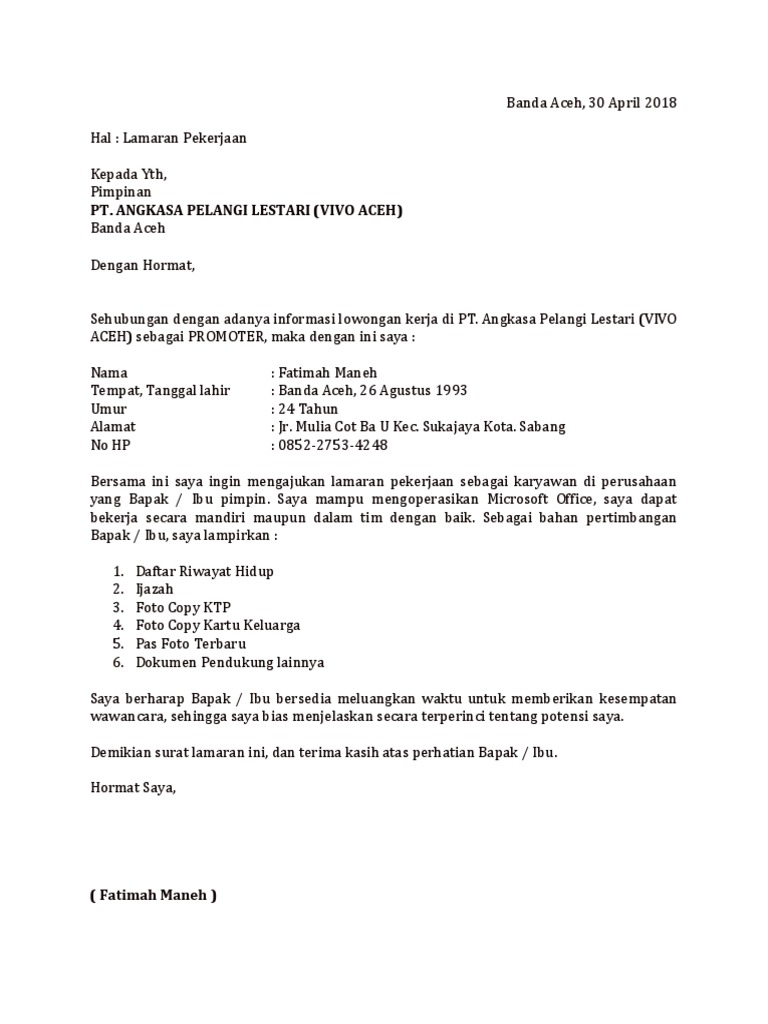 Contoh surat lamaran kerja di perusahaan seringkali dicari oleh para pencari kerja yang ingin mengajukan lamaran pekerjaan di perusahaan perusahaan yang ada di indonesia. Contoh surat lamaran kerja sebagai promotor vivo.