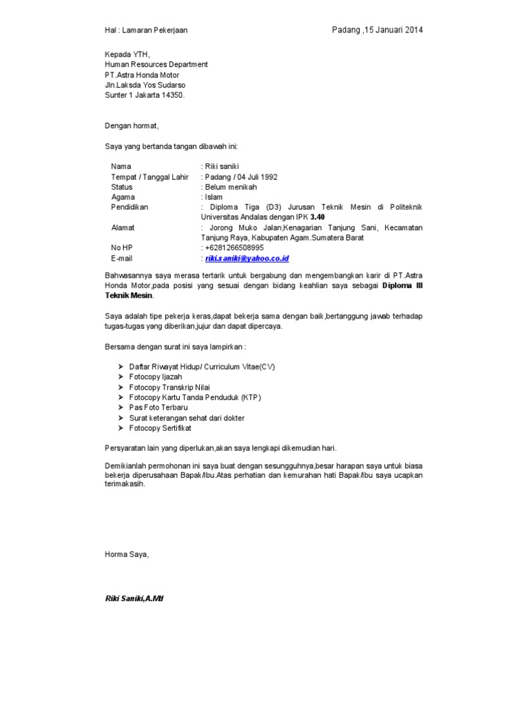 Contoh surat lamaran kerja pt astra honda motor. Contoh surat lamaran kerja astra honda motor contoh surat lowongan kerja di astra group salah satu tempat kerja written by della yulischa november 15 2019 add comment older posts home. Contoh surat lamaran pt astra honda motor have a graphic from the othercontoh surat lamaran pt astra honda motor it also will include a picture of a sort that could be observed in the gallery of contoh surat lamaran pt astra honda motor. The collection that consisting of chosen picture and the best amongst others. Contoh surat lamaran kerja astra honda motor contoh surat lowongan kerja di astra group salah satu tempat kerja yang selalu menjadi favorit dan incaran banyak orang setiap tahunnya adalah pt. Mayoritas sahamnya dimiliki oleh pt astra. Pt astra honda motor atau disingkat pt ahm merupakan salah satu perusahaan industri sepeda motor terbesar di indonesia.