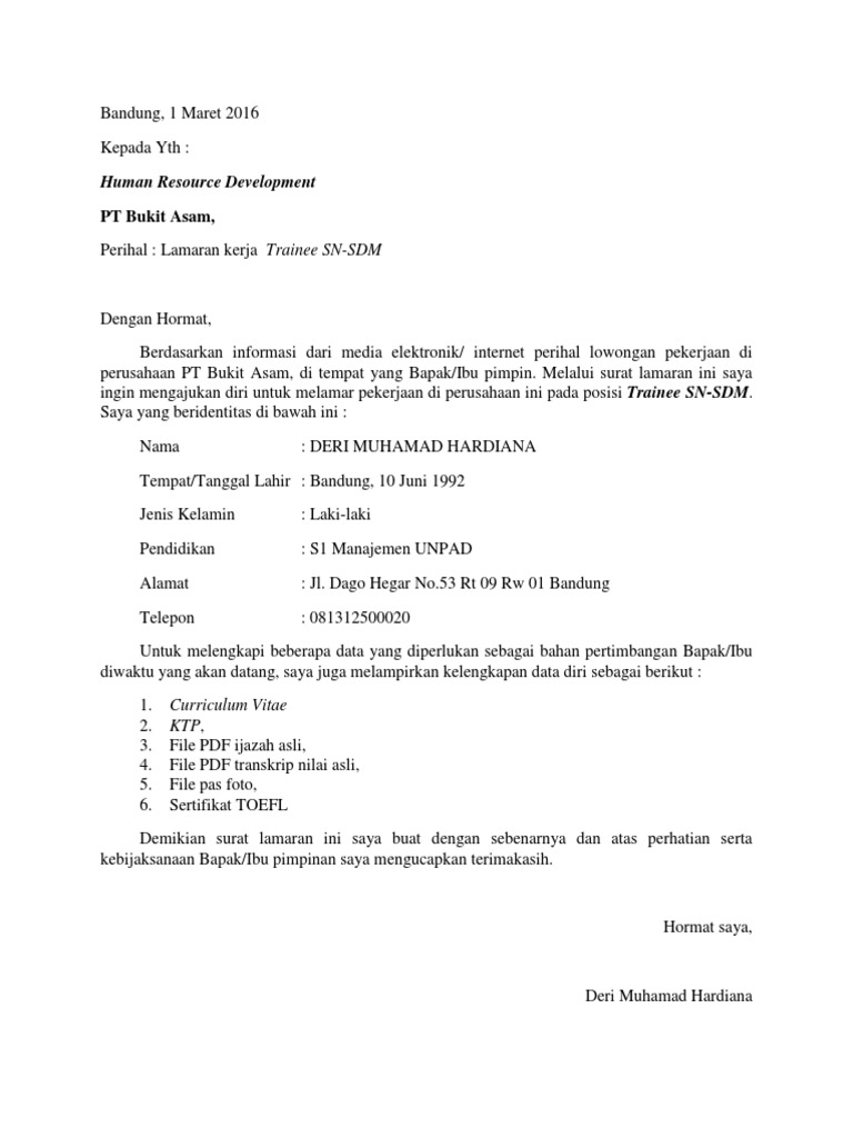 Contoh surat lamaran kerja pt bukit asam tbk. Lowongan kerja pt bukit asam 2020 loker bumn pt bukit asam tbk rekrutmen karyawan pt bukit asam lowongan kerja pt bukit asam untuk tamatan sma ma smk d3 s1 lowongan kerja bumn pt bukit asam terbaru bulan ini lowongan pekerjaan pt bukit asam sumsel pendaftaran loker pt bukit asam lowongan karir di pt bukit asam. Bagi anda yang kebingungan bagaimana caranya untuk membuat surat lamaran kerja yang baik dan benar untuk melamar pekerjaan di pt bukit asam tbk maupun perusahaan. 10 contoh cv lamaran kerja yang baik menarik hrd file doc. Apabila anda ingin melamar suatu pekerjaan. Contoh surat lamaran untuk pt bukit asam pt bukit asam kreatif mei 2020. Berikut ini adalah lowongan kerja pt bukit asam tbk.