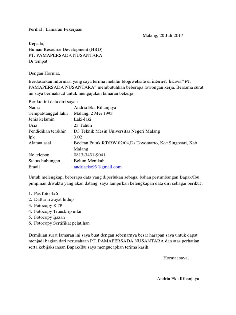 Apalagi jika mendapatkan pekerjaan di perusahaan bergensi dengan skala nasional atau international. Hrd pt nusantara jl. 15 contoh surat lamaran kerja di pt yang baik dan benar memiliki pekerjaan tetap tentunya menjadi dambaan setiap orang. Contoh surat lamaran kerja di perusahaan seringkali dicari oleh para pencari kerja yang ingin mengajukan lamaran pekerjaan di perusahaan perusahaan yang ada di indonesia. Sebagai seorang yang sudah lulu dari jenjang pendidikan baik formal maupun non formal tentunya anda membutuhkan hal hal berkaitan sistematika surat lamaran pekerjaan. Dalam menciptakan surat lamaran kerja tentunya ada kaidah penulisan dan tata letak yang harus diikuti alasannya yaitu ini merupakan.