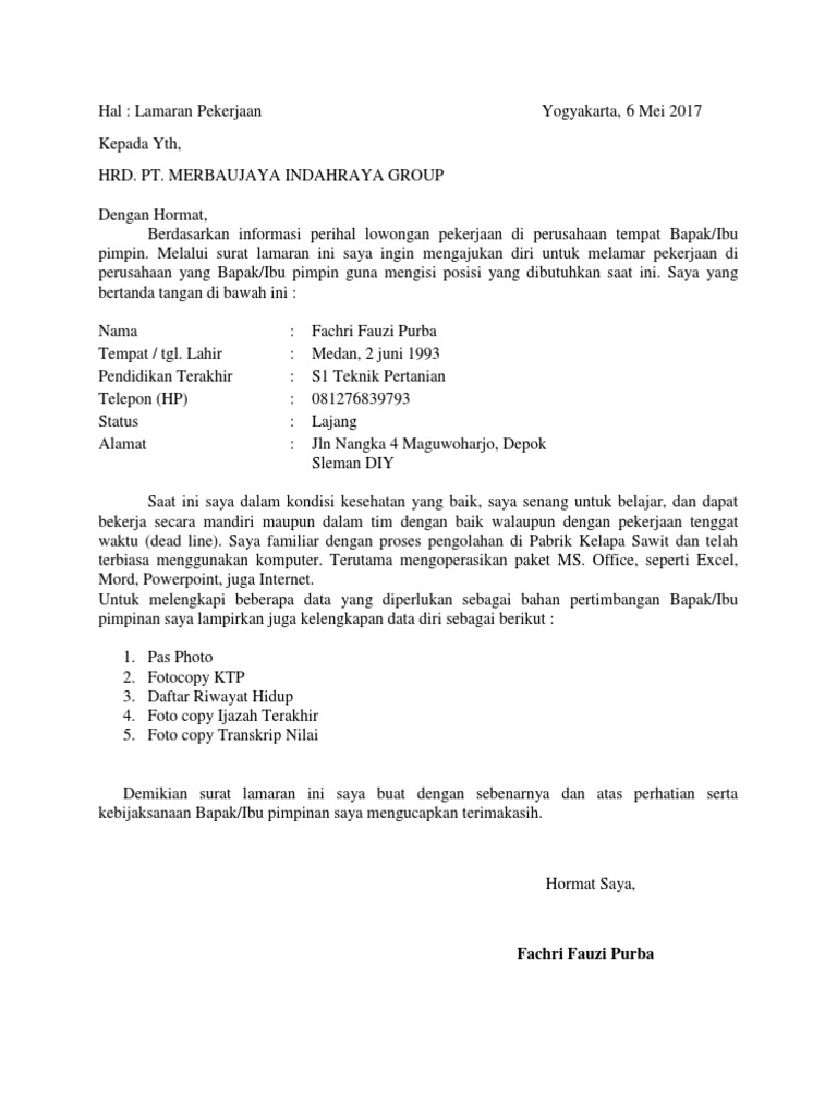 Contoh surat lamaran kerja pt sawit. Apalagi jika mendapatkan pekerjaan di perusahaan bergensi dengan skala nasional atau international. Contoh surat lamaran kerja ke perusahaan kelapa sawit have a graphic associated with the othercontoh surat lamaran kerja ke perusahaan kelapa sawit in addition it will include a picture of a sort that may be seen in the gallery of contoh. Baik mereka yang baru lulus kuliah s1 atapun mereka yang lulus sma atau smk tidak hanya mereka yang fresh graduate yang membutuhkan surat lamaran kerja mereka yang ingin pindah kerja juga membutuhkan surat lamaran kerja untuk tempat pekerjaan. Jul 07 2019 format gambar contoh surat lamaran kerja ke perusahaan kelapa sawit yang baik dan benar 2019. Contoh surat lamaran kerja di pabrik memiliki sebuah pekerjaan adalah keinginan semua orang. Contoh surat lamaran kerja adalah suatu hal yang sangat dibutuhkan oleh para orang yang sedang mencari pekerjaan yang sesuai dengan keinginannya.