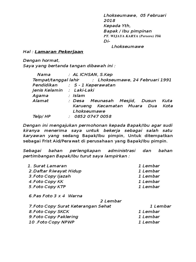 Contoh surat lamaran kerja pt wika. Lowongan pt wika gedung posisi schedule engineer. Wika yang kami sampaikan pada kesempatan kali ini bisa mempermudah anda dan anda bisa memahami bagaimana cara membuat contoh surat lamaran pekerjaan pt. Apalagi perusahaan yang kamu lamar adalah perusahaan besar ini menunjukkan etika kamu. Tips menulis surat lamaran kerja yang efektif. Contoh surat lamaran kerja untuk lulusan sma sederajat. Baik mereka yang baru lulus kuliah s1 atapun mereka yang lulus sma atau smk tidak hanya mereka yang fresh graduate yang membutuhkan surat lamaran kerja mereka yang ingin pindah kerja juga membutuhkan surat lamaran kerja untuk tempat pekerjaan.
