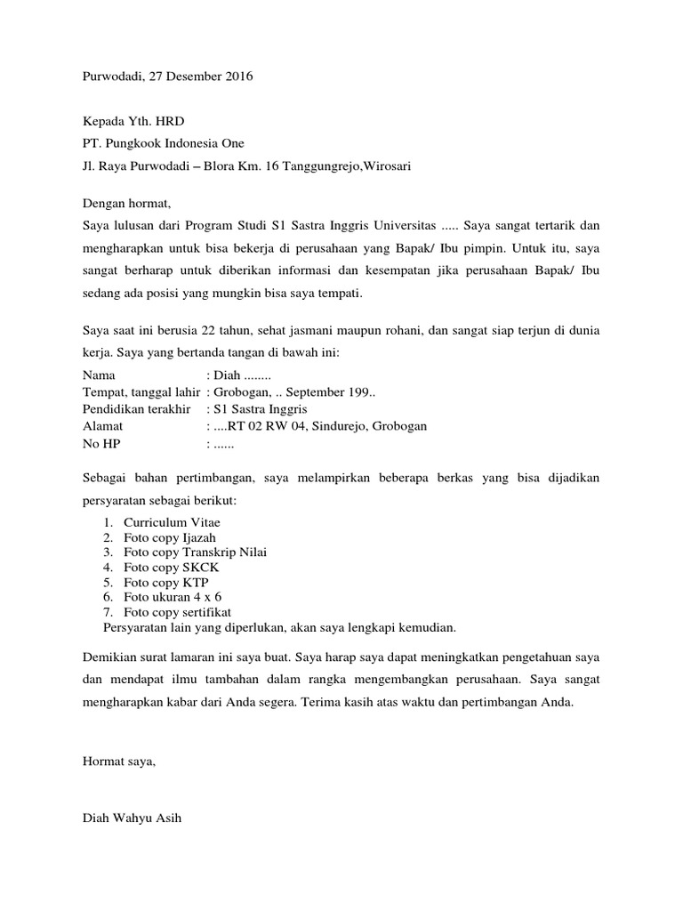 Contoh surat lamaran kerja security di pt. Contoh surat lamaran kerja di pt sebagai karyawan sekretaris. Contoh surat lamaran kerja satpam di era yang sudah serba teknologi dengan adanya internet pada saat ini anda bisa dengan mudah menemukan informasi mengenai lowongan kerja. Maka tidak heran ketika banyak orang membidik perusahaan dengan status pt perseroan terbatas. Nanti kita akan berikan contoh surat lamaran kerja sebagai security lengkap dengan link download contoh surat lamaran kerja yang terformat doc. Tugas anda hanya memilih mana posisi yang pas dan sesuai dengan passion anda untuk anda lamar. Jalan perintis no053 demak.