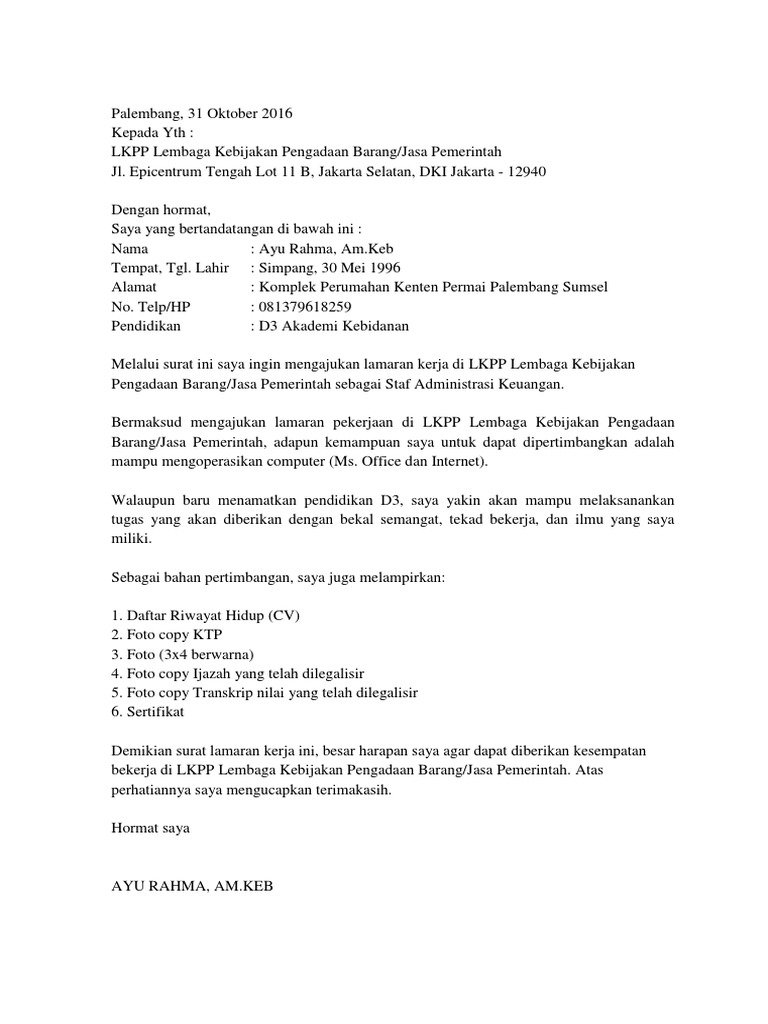 Contoh surat lamaran kerja lkpp. Contoh surat lamaran kerja ke lkpp contoh surat lamaran kerja contoh surat lamaran kerja yang baik dan benar contoh surat lamaran kerja bahasa inggris contoh surat lamaran kerja dan cv contoh surat lamaran cpns contoh surat lamaran kerja 2018 contoh surat lamaran kemenkumham contoh surat lamaran cpns kemenkumham 2017 contoh surat lamaran kerja via email contoh surat lamaran cpns 2018. Contoh surat lamaran kerja di bumn adalah contoh lamaran pekerjaan terbaru yang akan admin bagikan pada kesempatan ini untuk anda yang ingin melamar kerja di perusahaan bumn. Contoh surat permohonan pemotongan gaji contoh surat izin tidak masuk sekolah karena sakit.