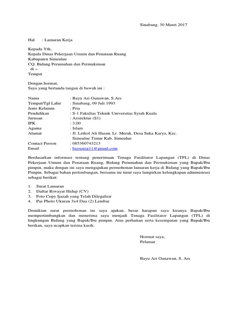 Contoh surat lamaran kerja pada artikel ini kita akan membahas contoh surat lamaran pekerjaan yang dapat kamu dapatkan beserta file doc nya. Contoh surat lamaran kerja ini dibuat tentu saja untuk menjadi referensi bagi anda yang sedang mencari panduan untuk membuat surat lamaran kerja. Surat lamaran biasanya bersandingan dengan cv lamaran kerjakeduanya adalah kunci penentu kamu diterima atau ditolak suatu instansi. Sebab pasti sebagai seorang manusia kita sangat membutuhkan mata pencaharian untuk bertahan hidup. Memang tidaklah sulit untuk membuatnya tetapi akan membutuhkan waktu untuk menyusun rangkaian kalimat sehingga. Meskipun pada hakikatnya hanya sebagai jalan rezeki dari tuhan.