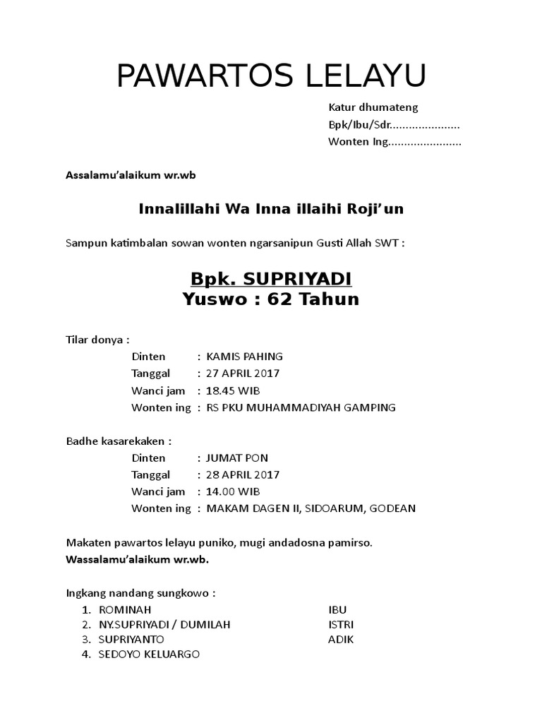 Artikel 59 event 21 profil 12 agenda 7 lokasi 2 kontak 1 testimoni 1 contoh surat berita lelayu bahasa jawa. Bapakibu ing innalilahi wainna ilahi rojiun assalaamualaikum wrwb sampun tinimbalan wonten ngarsanipun pangeran.