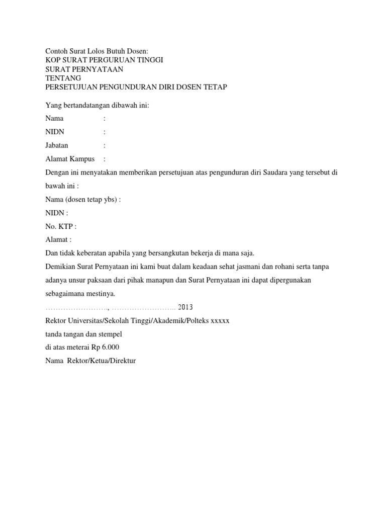 Contoh surat lolos butuh dosen. Dalam sebuah struktur didalam organisasi perusahaan ada kalanya kita ditempatkan berada diatas atau bahkan turun jabatan. Silakan berlama lama di sini dan membaca lebih lanjut tentang artikel yang telah saya sediakan. Surat rekomendasi dari koordinator perguruan tinggi swasta kopertis jika dosen ybs merupakan dosen perguruan tinggi swasta. Contoh surat lolos butuh dosen. 2 surat lolos butuh persetujuan pindah dari pimpinan pts lama. 4 sk pengangkatan dari yayasan perguruan tinggi yang baru yang memuat hak dan kewajiban sebagai dosen tetap.