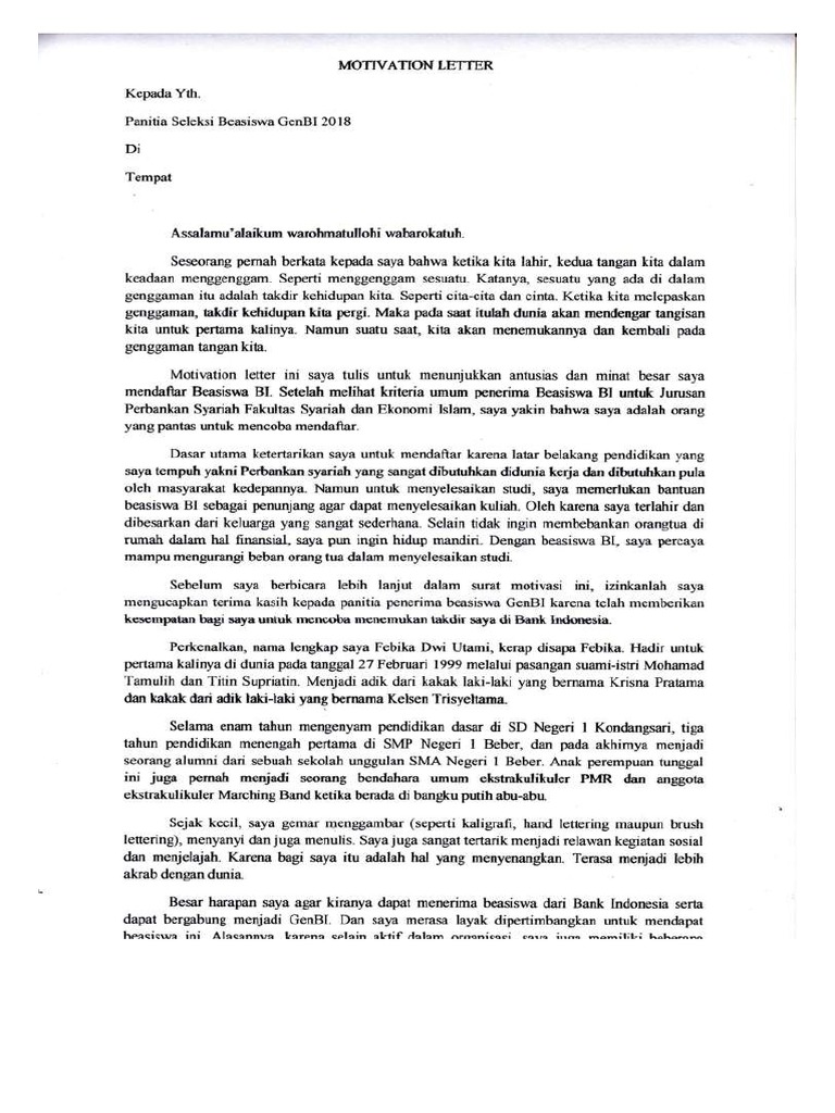 Untuk contoh menjadi panitia suatu kegiatan silahkan download pada link di bawah ini. Jika kamu ingin mendapatkan beasiswa dari bank indonesia. Motivation letter nama saya abdul malik firdaus. Motivation letter merupakan sebuah surat yang berisi tentang penjelasan akan motivasi kita untuk bergabung kedalam sebuah perusahaan ataupun untuk melamar sebuah beasiswamotivation letter merupakan surat yang dianggap sangat penting yang akan mendampingi cv atau curriculum vitae karena. Melalui contoh kita membahas contoh surat motivasi mana yang harus dipelajari di luar negeri. Download motivation letter 1 motivation letterdoc downloaded 3568 times 31 kb.