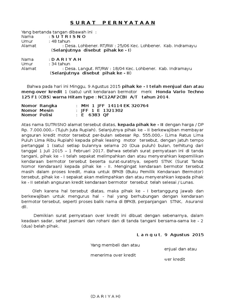 Kumpulan contoh contoh surat lamaran kerja kontrak jual beli perjanjian kerjasama dan sebagainya. Over kredit over kredit honda. Bilamana kendaraan sepeda motor tersebut ditarik oleh finance yang diakibatkan kemacetan oleh pihak kedua maka resiko tersebut sepenuhnya menjadi tanggung jawan pihak kedua. Contoh surat pernyataan over kredit kendaraan. Semoga informasi ini membantu anda. Demikianlah surat pernyataan over alih kredit rumah ini kami buat atas dasar musyawarah dan mufakat bersama dalam keadaan sehat jasmani dan rohani dan tanpa adanya paksaan dari pihak manpun juga.