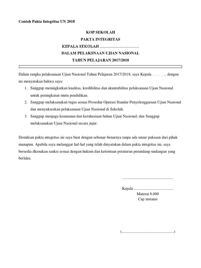 Contoh surat pakta integritas kepala sekolah. Pakta integritas ini berisi pernyataan pernyataan seseorang terkait dengan kesediaannya bekerja sesuai dengan tugas dan tanggung jawab pekerjaannya. Contoh surat pakta integritas perusahaan mahasiswa guru contoh surat pernyataan pakta integritas wisanggeni. Pakta integritas untuk kepala sekolah dan panitia unbk 2019 bebas edit adjie contoh surat dokumen pernyataan dan kesanggupan untuk melaksanan ujian nasional berbasis komputer unbk. Semoga artikel kami ini dapat membantu anda dan jika da kesalahan kata dalam penulisan kami mohon maaf. Berikut ini adalah contoh. Murtinah spdsd nip.