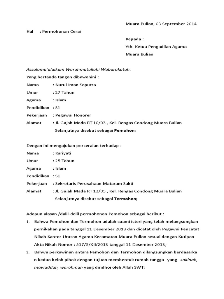 3 tahun yang lalu. Serta diajukan pada waktu sedang sidang tersebut di atas. Surat panggilan sidang dua minggu berlalu dari hari pendaftaran akhirnya susan menerima surat dari pengadilan agama jak sel. Mohon penjelasan terima kasih. Nama surat seperti pada surat pernyataan lain pada umumnya hal pertama yang harus dicantumkan adalah nama surat itu sendiri. Contoh surat permohonan cerai 2012 12 september 3 august 1 june 1.