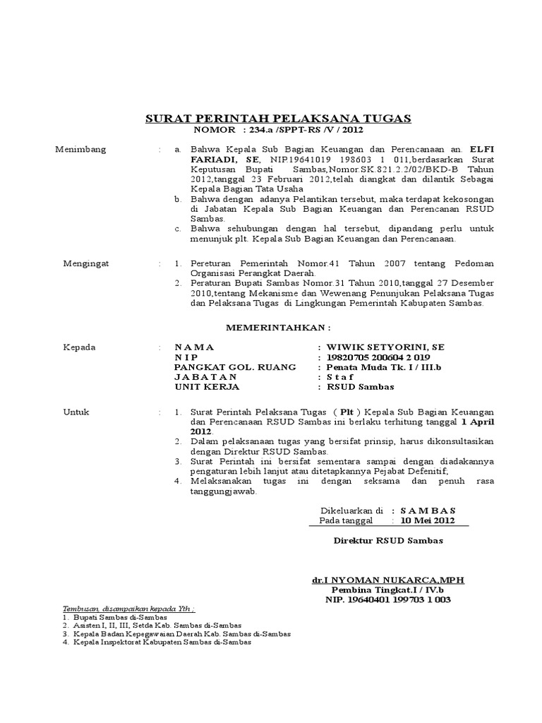 Karena menjalankan mandat menurut surat edaran badan kepegawaian negara nomor 2sevii2019 tahun 2019 tentang kewenangan pelaksana harian dan pelaksana tugas dalam aspek kepegawaian se bkn 22019 plh atau plt tidak berwenang mengambil keputusan danatau tindakan yang bersifat strategis yang berdampak pada perubahan status hukum pada aspek organisasi kepegawaian dan alokasi anggaran. Contoh sk pengangkatan plt 2020 contoh surat tugas plt sekdes 2018 contoh sk plt kasubag mekanisme pengangkatan plt sekdes academia contoh sk sekdes 2017 doc sk plt kepala desa contoh surat plt kepala desa 2019 scribd slideshare pdf sk pengangkatan sekretaris desa terbaru contoh format surat keputusan sk sekdes sekretaris desa keputusan kepala desa tentang pengangkatan plt sekdes. Contoh surat penunjukan tugas sementara. Download contoh surat penunjukan tugas july 1 2020 june 30 2020 by nurul saputro surat penunjukan adalah salah satu surat resmi yang dibuat oleh pihak yang mempunyai kewenangan yang mana ditujuakn kepada sebuah lembagaperusahaan ataupun perseorangan yang mana untuk dapat melakukan beberapa hal sesuai dengan isi surat penunjukan tersebut. Surat tugas ini bisa diartikan sebagai surat yang dikeluarkan oleh instansi tertentu atau pihak yang lebih tinggi dan ditujukan kepada bawahannya untuk melaksanakan sebuah tugas. Kali ini yang akan menjadi topik pembahasan kita adalah mengenai contoh surat tugas lengkap terbarulalu apa itu surat tugas dan bagaimana bentuk dari surat tugas itu sendiri.