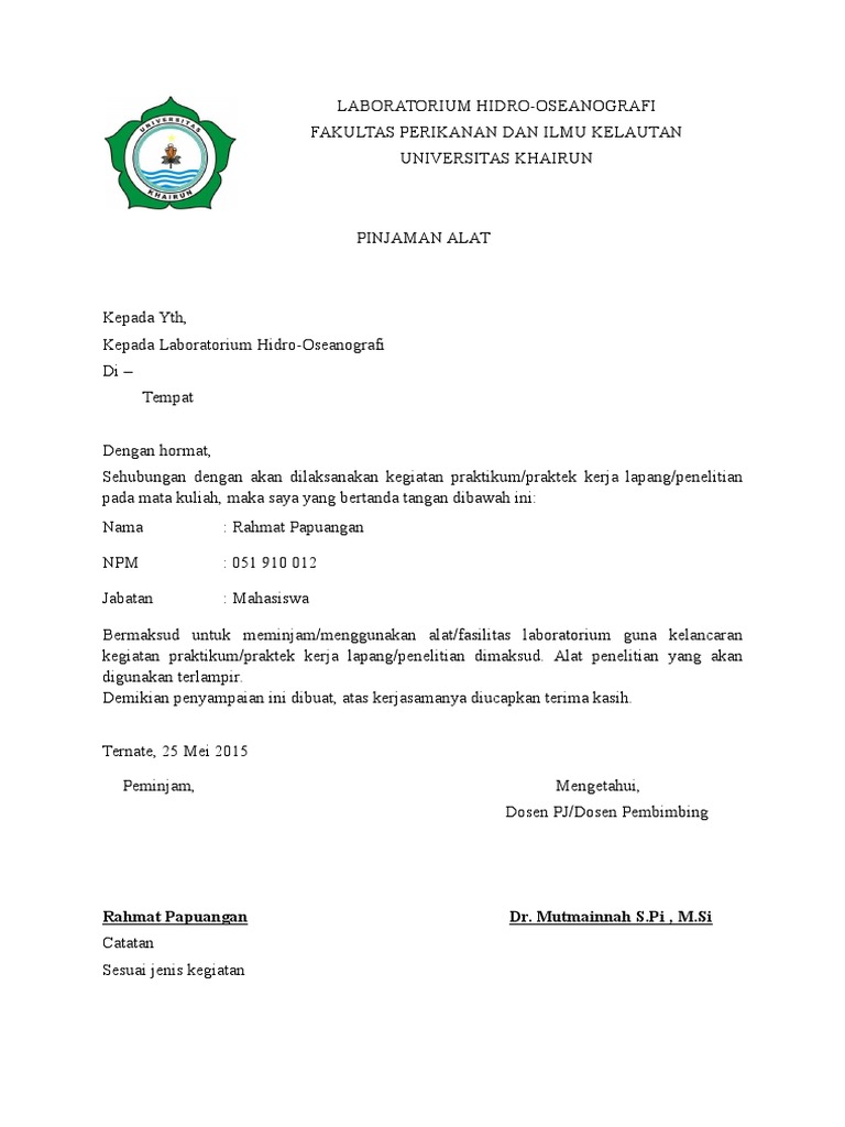 Contoh surat peminjaman alat lab. Contoh surat izin peminjaman alat kop surat watampone 10 april 2011 hal. Kepala nama jurusan yang bersangkutan universit. Sebelum menulis tentang contoh surat permohonan izi peminjaman sarana prasana sekolah saya ucapkan selamat tahun baru 2017. Teknik lingkungan universitas diponegoro di semarang. Surat peminjaman tempat contoh surat peminjaman gedung tempat kegiatan pinjam pakai alat kartika bluesky september 19 2019 contoh surat no comments makalahid bagi yang sering menjadi panitia di sebuah event atau bekerja dalam bidang persuratan tak asing dengan surat peminjaman tempat. Template surat permohonan peminjaman alat.
