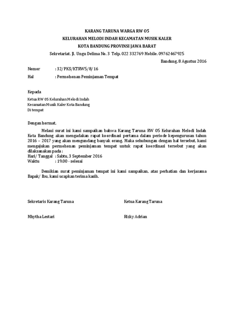 Dalam meminjam suatu tempat tetap harus menggunakan surat peminjaman tempat sebagai dasar sekaligus bentuk pertanggung jawaban apabila terjadi sesuatu dikemudian hari. Sepertia pada kesempatan sebelumnya dikesempatan ini kami juga akan membahas informasi seputar berbagai contoh surat yang akan kami bahas dikesempatan ini tentang kumpulan contoh surat undangan rapat yang benar bagi anda yang ingin mengetahui seperti apa seh cara. Berikut contoh surat pengajuan ijin. Contoh surat undangan rapat bagi anda yang berkecimpung dalam dunia organisasi pendidikan maupun yang bekerja di perusahaan pasti sudah tidak asing lagi dengan kegiatan rapat. Surat ini digunakan untuk memohon contoh surat pemberitahuan hasil rapat yang baik. Ketika kita atau suatu organisasi perusahaan dsb akan melakukan acara tertentu dan kita akan melaksanakan acara tersebut disuatu tempat dan kita akan meminjam atau menyewanya maka perlu untuk mengajukan permohonaan untuk meminjam tempat tersebut terlebih dahulu.