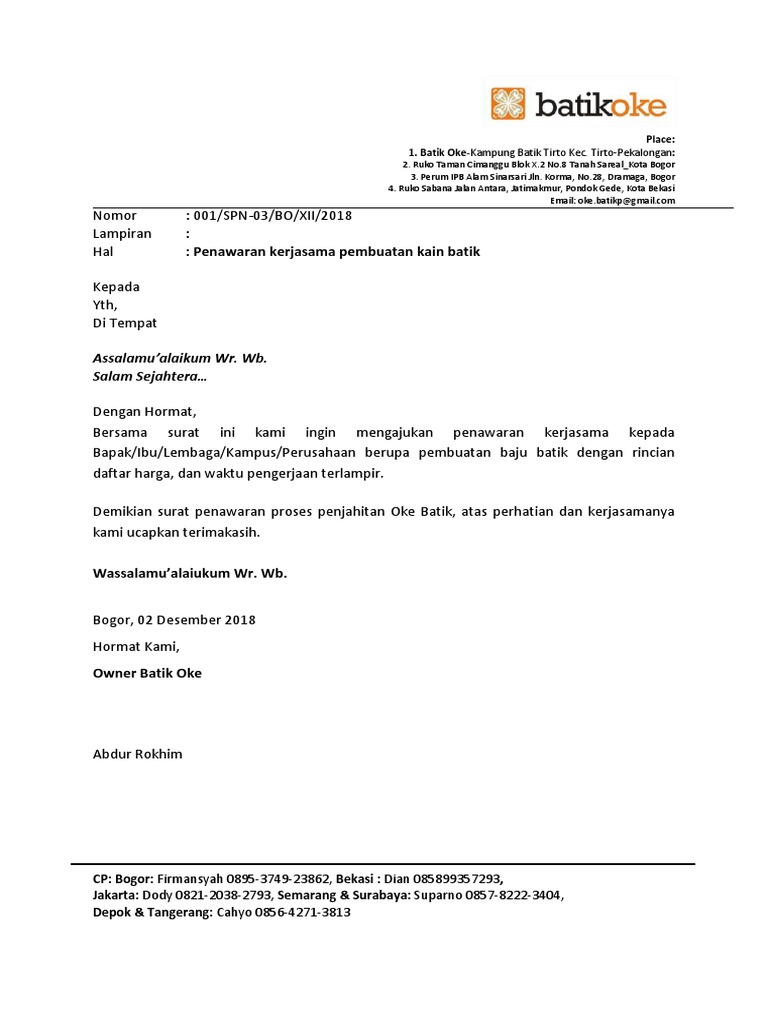 Universal batik bsd griya loka bsd sektor 16 jalan kubis iii blok a 5 no. Bpk ibu pimpinan sekolah di tempat assalamualaikum wr. Contoh surat penawaran barang kain batik. Sehingga dengan begitu calon pembeli jadi tahu berapa harga barang servis pelayanannya persyaratan jual beli dan lain lain. Contoh surat penawaran kain adalah gambar contoh surat berdefinisi tinggi dan memiliki ukuran 1131x1600. Surat penawaran lampiran.