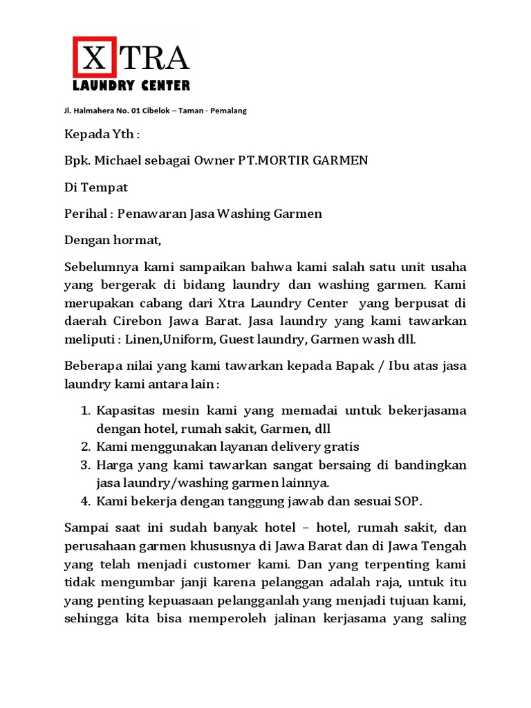 Anda dapat melihat dengan jelas contoh surat penawaran jasa laundry menggunakan desktop anda tablet android atau iphone dan perangkat smartphone lainnya secara gratis. Contoh surat penawaran jasa laundry adalah gambar contoh surat berdefinisi tinggi dan memiliki ukuran 768x1024. Semoga berguna untuk anda. Contoh surat perjanjian laundry surat penawaran jasa laundry hotel ini saya kirim ke user dan akhirnya menghasilkan kesepakatan yagn menggembirakan. Kemudian bisa disertai dengan penawaran menarik yang ditawarkan ketika pemasaran dilakukan jenis fasilitas dan layanan apa saja yang diberikan. 15 contoh surat penawaran jasa yang baik dan paling lengkap dalam menjalankan sebuah perusahaan tentu akan sangat sering menggunakan surat niaga.