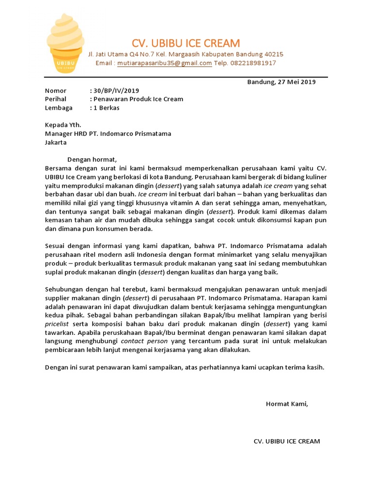 Surat niaga dipergunakan dalam berbagai keperluan perusahaan untuk mendapatkan keuntungan sebanyak banyaknya. Biasanya surat penawaran ini dibuat oleh para pengusaha atau pebisnis dalam segi ekonomi berupa negosiasi tentang penjualan dan pembelian dengan mencantumkan harga yang ditawarkan. Biasanya surat penawaran juga akan mencamtukan tentang nomor surat agar supaya konsumen atau perusahaan yang dituju semakin ppercaya bahwasanya memang surat penawaran ini asli dan secara resmi telah dikeluarkan. 330 bukit tinggi jakarta selatan telp. Salah satu cara memasarkan kue adalah dengan menitipkan ke toko makanan yang besar.