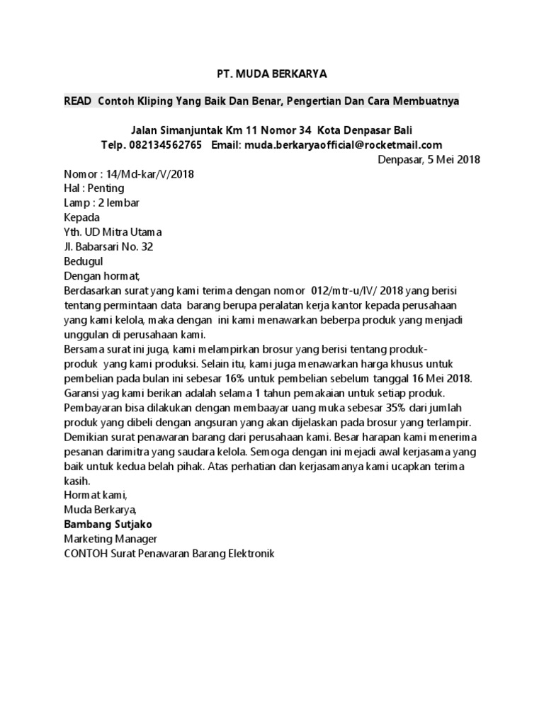 Contoh surat penawaran yang baik dan benar. Bentuk kerjasama biasanya berupa jual beli barang atau jasa. Baca juga contoh surat keterangan kerja yang baik dan benar. Didalam dunia bisnis surat penawaran merupakan salah satu surat yang memiliki tujuan untuk menawarkan barang atau jasa dari perusahaan anda yang umumnya perusahaan anda merupakan sebagai distributor atau pun supplier dari barang maupun jasa yang anda tawarkan. Meskipun konsumen itu merupakan konsumen berlangganan untuk terwujudnya kelancaran dan kesinambungan interaksi kamu dgn buyer maupun pada supplier dgn agen jadi surat penawaran barang yaitu resmi dan wajib. Penawaran barang lampiran. Contoh surat penawaran barang.