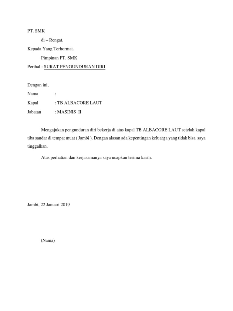 Contoh surat pengunduran diri dari kapal. Mengundurkan diri adalah sesuatu yang wajar dilakukan oleh siapaun yang berada dalam sebuah tanggung jawab perusahaan organisasi atau instansi lainnya. Setelah sebelumnya saya membahas tentang contoh surat lamaran kerja kali ini saya akan membahas contoh surat pengunduran diri yang baik dan benar. Dengan hormat saya yang bertanda tangan di bawah ini. 9 cara menjaga kesehatan mental. Contoh surat resign pengunduran diri pada artikel sebelumnya kita telah membahas secara lengkap mengenai surat pernyataan yang baik dan benar dan pada kesempatan ini kita akan membahas jenis surat lainnya yang tak kalah diperlukan yakni surat resign atau pengunduran diri dari pekerjaan. Sukasenang jaya dikarenakan kurang memberikan kontribusi yang baik untuk perusahaan.