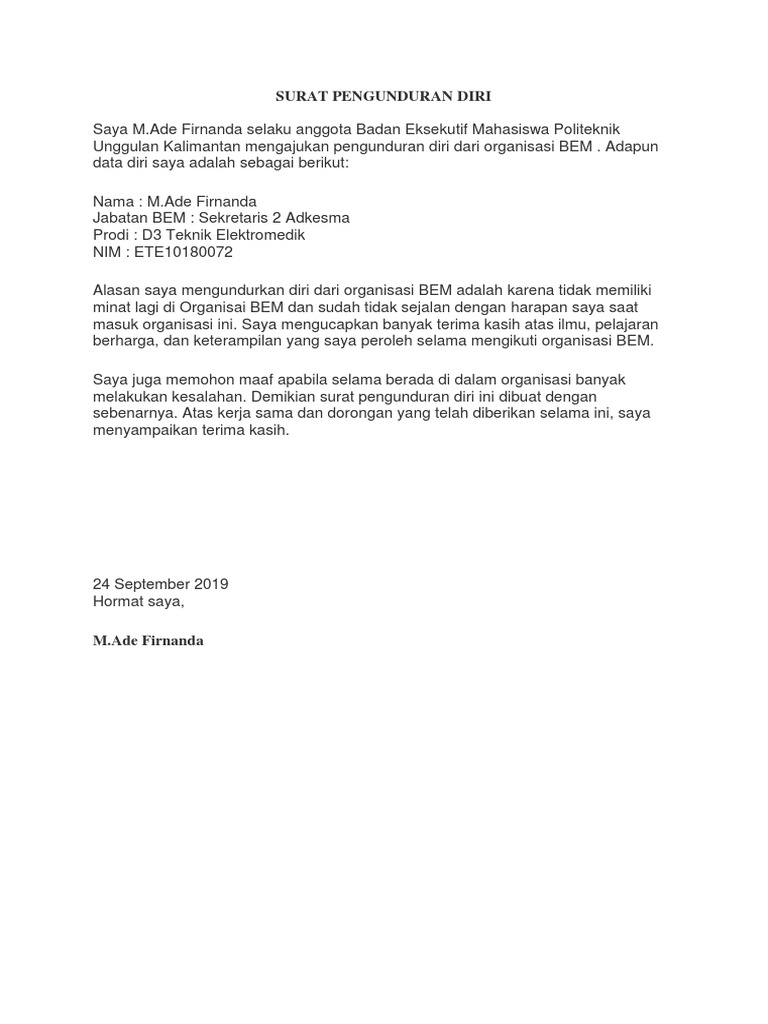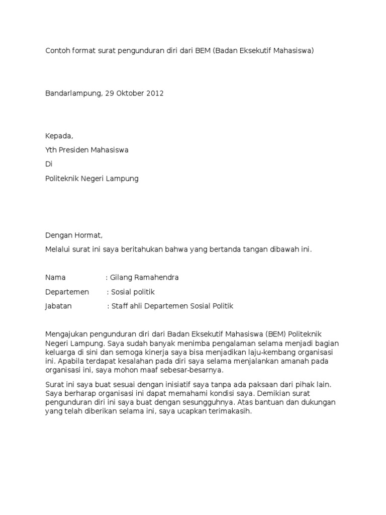 Contoh surat pengunduran diri dari organisasi bem. 15 contoh surat pengunduran diri dari organisasi paling lengkap keputusan untuk mengundurkan diri dari suatu perkumpulan atau kelompok tentu merupakan keputusan yang besar dan bisa memberikan dampak tertentu terhadap diri anda sendiri. Namun terkadang dikarenakan berbagai alasan seseoran harus dan terpaksa untuk mengundurkan diri dari suatu kelompok. Tedapat banyak sekali versi dari surat pengunduran diri organisasi yang beredar di masyarakat mulai dari surat pengunduruan diri osis. Nah demi membantu anda disini kami akan membahas. Mengajukan surat pengunduran diri dari badan eksekutif mahasiswa bem universitas bangun bangsa. Mengundurkan diri adalah sesuatu yang wajar dilakukan oleh siapaun yang berada dalam sebuah tanggung jawab perusahaan organisasi atau instansi lainnya.