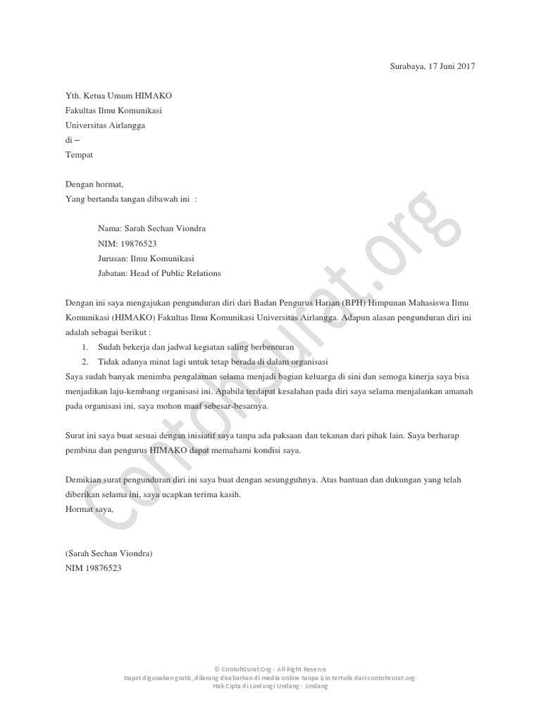 Contoh surat pengunduran diri dari organisasi mahasiswa. Contoh surat pengunduran diri dari kuliah walaupun hampir sama dengan surat pengunduran diri dari sekolah tetapi jauh lebih rumit formatnya. Ada banyak jenis dan contoh surat pengunduran diri dari organisasi yang mungkin akan anda butuhkan. Misalnya terpaksa harus mengundurkan diri dari salah satu perguruan tinggi pilihannya. Contoh surat pengunduran diri organisasi kampus yang baik dan benar surat pengunduran diri o. Salam hormat dengan surat ini saya kahla rifda memohon untuk mengundurkan diri dari bank bni syariah sebagi manager training mt officer. Namun terkadang dikarenakan berbagai alasan seseoran harus dan terpaksa untuk mengundurkan diri dari suatu kelompok.