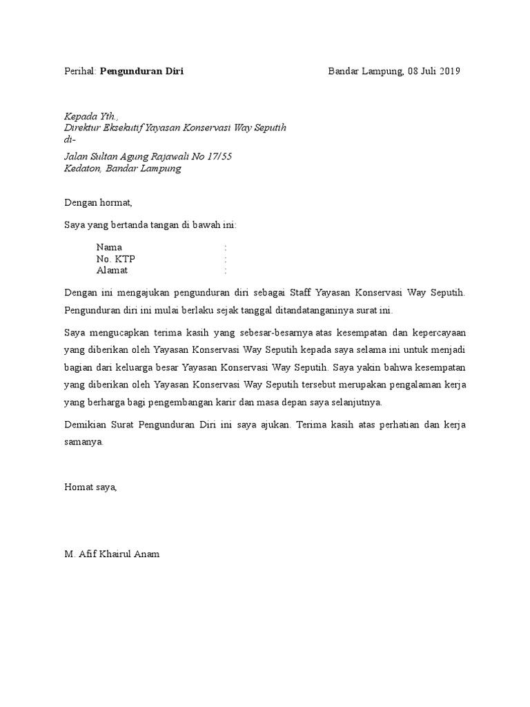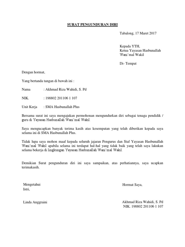 Contoh surat pengunduran diri dari yayasan. Tempatdengan hormat dengan surat ini saya mengajukan permohonan pengunduran diri sebagai kepala sekolah smp negeri 03 ngawi terhitung sejak tanggal 11 agustus 2017. Sama halnya dengan keluar dari perusahaan apabila anda ingin berhenti kerja dari sekolah tentu harus membuat surat pengunduran diri. Contoh surat resign pengunduran diri pada artikel sebelumnya kita telah membahas secara lengkap mengenai surat pernyataan yang baik dan benar dan pada kesempatan ini kita akan membahas jenis surat lainnya yang tak kalah diperlukan yakni surat resign atau pengunduran diri dari pekerjaan. Begitulah contoh surat pengunduran diri dari organisasi biasanya lebih panjang dari pada surat resign kerja. Ada banyak alasan seorang guru ingin resign dari pekerjaannya sebagai guru. Bapak ketua yayasan pendidikan smp negeri 03 ngawi jawa timurdi.