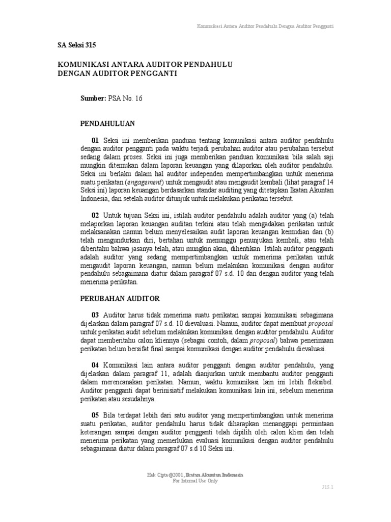 Dengan dibuatnya surat penugasan audit yang berisikan perjanjian antara auditor dan pihak perusahaan maka hal ini tentu akan memperjelas tingkat tanggung jawab auditorsehingga hal ini dapat digunakan sebagai alat informasi bagi para pemakai laporan keuangan bahwa auditor tidak bertanggung jawab atas terjadinya hal hal atau peristiwa yang tidak berkaitan dengan perjanjian yang telah. Oleh dosenpendidikan diposting pada 16072020. Yang membedakan surat tugas dengan surat resmi lainnya ada di bagian isi bahwa dalam surat tugas dinas harus ada identitas pemberi wewenang atau pejabat atasan identitas pegawai serta instansi yang dituju. Bagian bagian surat juga hampir sama yaitu kepala surat isi surat penugasan dan penutup. Menurut wikipedia surat perikatan audit audit engagement letter adalah surat persetujuan antara auditor dengan kliennya tentang syarat syarat pekerjaan audit yang akan dilaksanakan oleh auditor. Di dalam memutuskan apakah suatu perikatan audit dapat diterimatidak auditor menempuh suatu proses yang terdiri dari 6 tahap yaitu.