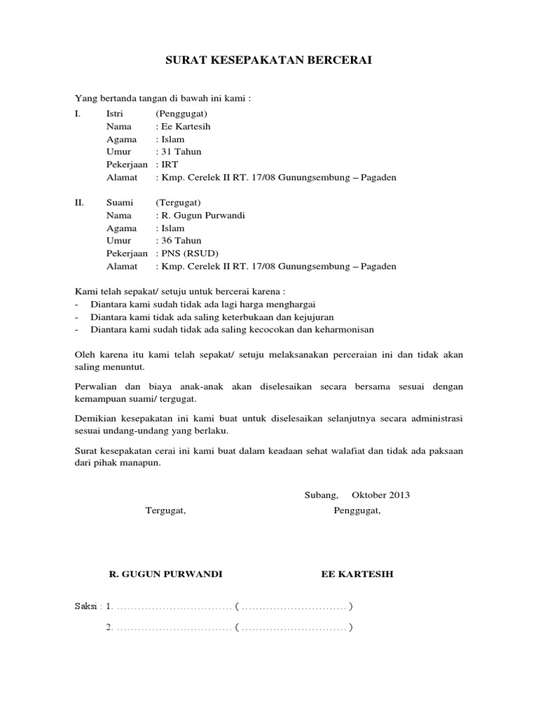 Contoh surat perjanjian cerai. Nama surat seperti pada surat pernyataan lain pada umumnya hal pertama yang harus dicantumkan adalah nama surat itu sendiri. 29 29 mendukung tandai dokumen ini sebagai bermanfaat 5 5 menolak tandai dokumen ini sebagai tidak bermanfaat tanamkan. Isi surat pernyataan cerai berisi tentang pernyataan bahwa kedua belah pihak sepakat untuk bercerai. Saksi saksi mencantumkan beberapa orang saksi dalam proses perceraian. Identitas pihak pertama yang meminta cerai poin selanjutnya adalah menyebutkan identitas diri secara jelas pihak pertama atau pihak yang meminta perceraian. Di dalamnya biasanya terdapat nama tempat dan tanggal lahir usia alamat dan sebagainya.