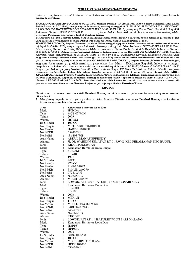 Contoh surat perjanjian fidusia. Bayangkan jaminan fidusia harus dibuat di hadapan notaris sementara lembaga pembiayaan melakukan perjanjian dan transaksi fidusia di lapangan dalam waktu yang relatif cepat. Contoh surat fidusia asli admin sampaikan contoh surat fidusia asli untuk anda yang ingin membuat contoh surat fidusia asli karena kami menyampaikan format contoh surat fidusia asli lengkap dan kami berikan dibawah supaya anda bisa men contoh surat fidusia asli ini. Untuk itu langsung saja baca dibawah ini contoh surat fidusia asli tersebut. Perjanjian fidusia adalah perjanjian hutang piutang kreditor kepada debitor yang melibatkan penjaminan. Fidusia adalah suatu perjanjian hutang piutang antara pemilik jaminan dengan penerima jaminan atau antara debitur dengan kriditur atau biasanya lebih sering di lakukan oleh lembaga keuangan dan leasing dan untuk fidusia itu sendiri objek jaminan tetap di kuasai oleh debitur atau pemilik jaminan sedangkan bukti kepemilikannya dikuasa oleh kreditur atau yang memberikan kredit. Contoh surat perjanjian hutang piutang ketika kita melakukan kegiatan hutang piutang pasti akan membutuhkan sebuah contoh surat perjanjian hutang piutang yang benar sebagai acuan sehingga tidak terjadi hal hal yang bisa merugikan antara kedua belah pihak.