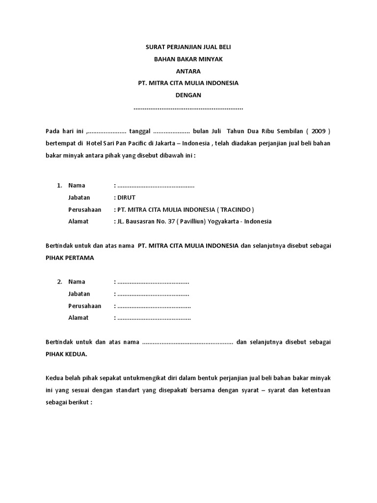 Tetapi nilainya besar maka anda membutuhkan surat perjanjian jual beli. Terlibat dalam kegiatan pengadaan bahan bakar bensinmasih belum berkembang karena perjanjian pengadaan bahan bakar yang dibuat oleh pertamina dan spbu 44 57610 nguntoronadi di wonogiri hanya terbatas pada perjanjian jual beli saja dimana pedagang dalam hal ini pihak pertamina sabagai pemberi kredit atau penjual dan spbu sebagai debitur. Bukti transaksi dibuat berdasarkan nilai dari barang yang diperjualbelikan. Contoh contoh dokumen hukum selasa 16 desember 2014. Jika nilainya kecil maka bukti bisa berupa kwitansi atau strukt pembelanjaan. Lebih baik lagi jika anda melantik peguam hartanah untuk memastikan terma terma yang disediakan lebih lengkap dan tepat untuk melindungi kedua dua pihak.