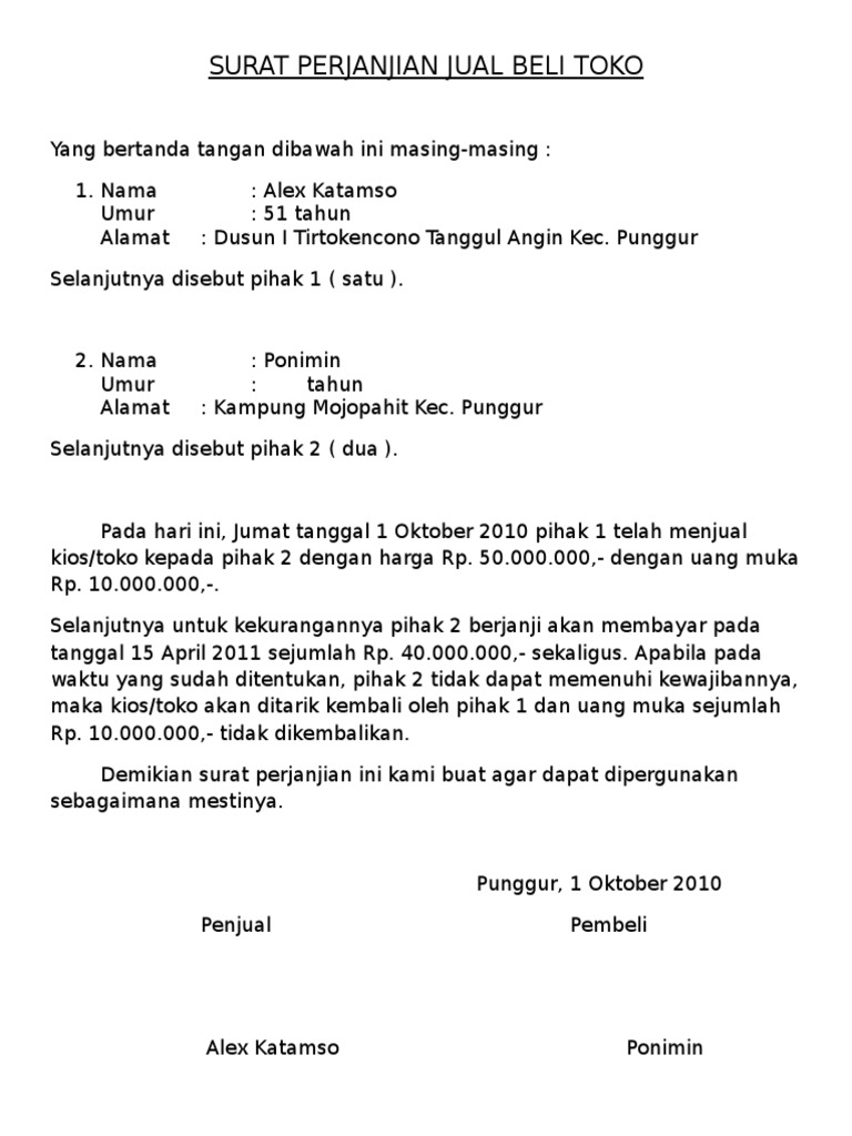 Hal ini sangat berguna untuk menghindari perselisihan di kemudian hari. Adalagi contoh surat perjanjian jual beli tanah yang dilakukan di perkampungan dengan model yang berbeda namun tetap mengikuti muatan prasyarat surat perjanjian yang telah diatur dalam perundang undangan. Contoh surat perjanjian jual beli sangat beragam karena ada banyak jenisnya seperti surat perjanjian jual beli rumah surat perjanjian jual beli motor surat perjanjian jual beli tanah dll. Surat ini bersifat penting karena saat kita telah membeli sesuatu menjadi sebuah bukti yang sah di mata hukum barang tersebut status kepemilikannya pindah ke pihak kita sebagai pembeli. Pengalaman buat surat perjanian saya juga melihat beberpa contoh surat perjanjian di internet surat perjanjuan jual beli tanah dengan uang muka misal ada juga surat perjanjian jual beli mobil kredit ruko seperti di atas. Secara garis besar hal hal penting yang perlu diperhatikan ketika menyusun surat perjanjian jual beli tanah yang benar adalah sebagai berikut.