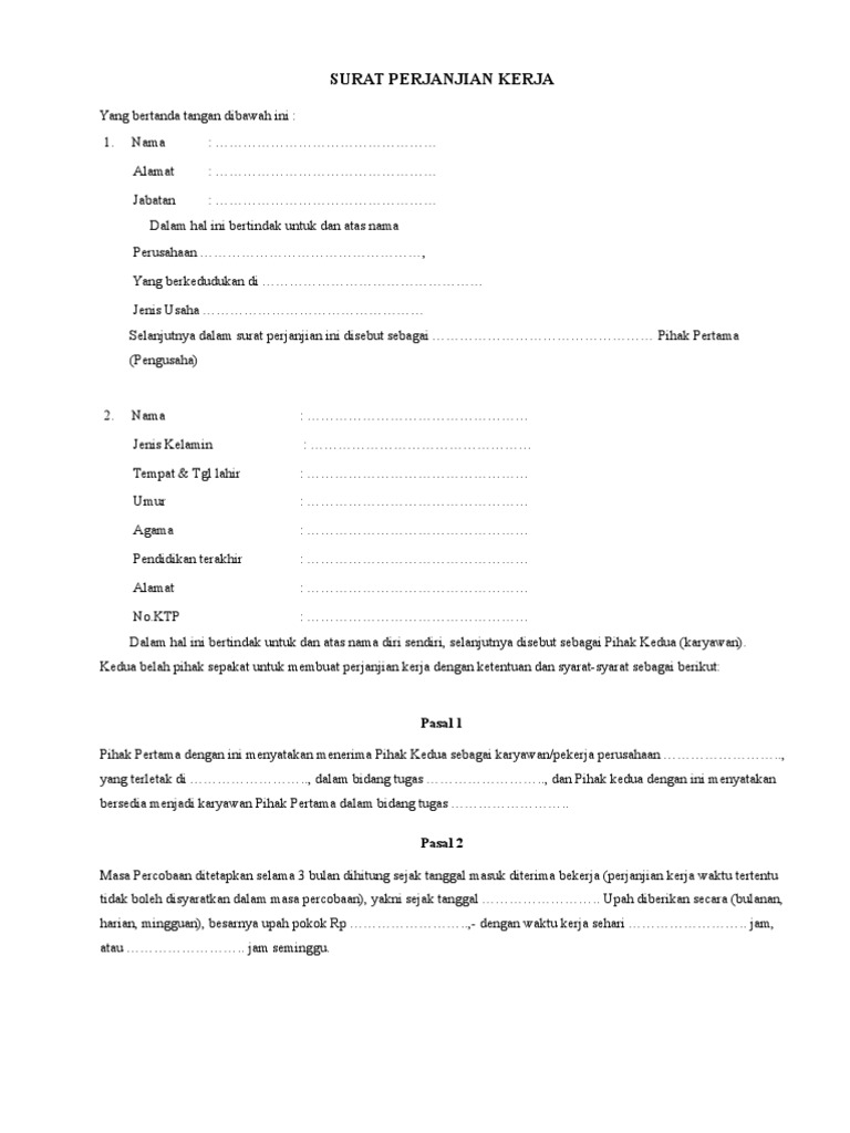 Surat perjanjian kerja probation. Ini artinya masa percobaan hanya dapat diberlakukan bagi pekerja dengan perjanjian kerja waktu tidak tertentu pkwtt dan mengenai lamanya masa percobaan hanya dapat berlaku selama 3 tiga bulan. Cukup dengan ada surat keputusan pengangkatan karyawan masa percobaan. Dalam pasal 60 uu ketenagakerjaan dijabarkan perjanjian kerja untuk waktu tidak tertentu dapat mensyaratkan masa probation kerja paling lama tiga bulan. Demikian surat perjanjian kerja ini dibuat tanpa adanya paksaan dari pihak manapun. Contoh surat perjanjian kerja pada aktifitas kerja terdapat surat perjanjian yang digunakan untuk membuat kesepakatan antar pihak pihak yang terlibat dalam kerjasama.